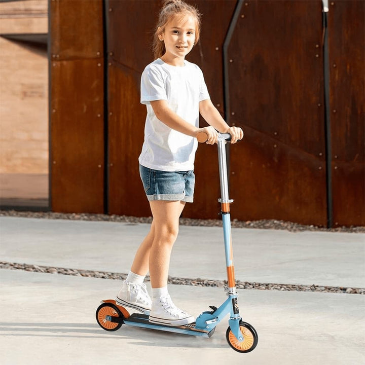 Cu această trotinetă pliabilă cu frână de picior, de culoare albastră cu portocaliu, de la XQ Max, copiii dvs. se pot distra din plin plimbându-se din dragoste pentru aventură sau pentru distracție.