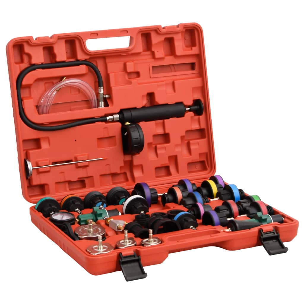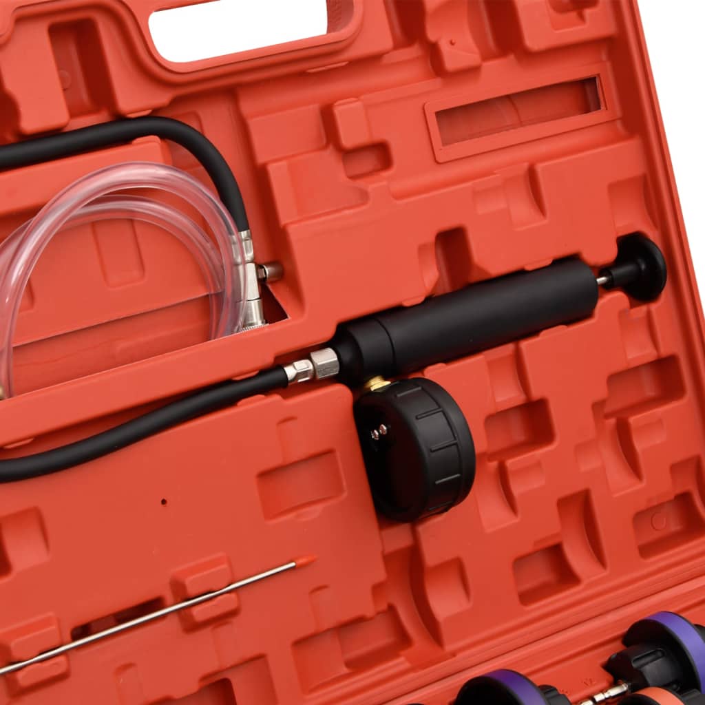 - Ușor de utilizat: Pompa manuală creează suprapresiune în sistem prin adaptoarele specifice vehiculului de pe radiator sau prin rezervorul de expansiune și permite verificarea etanșării prin intermediul unui indicator de presiune. Datorită suprapresiunii din sistem, scurgerile pot fi detectate prin inspecție vizuală dacă există o pierdere de presiune.