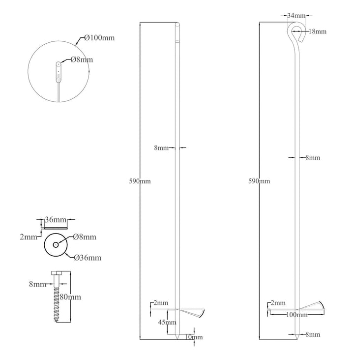 Țărușul de ancorare la sol este realizat din metal electro-galvanizat, ceea ce-l face rezistent la intemperii și la putrezire. Este format dintr-o tijă cu un cerc deasupra și cu una sau două spirale în partea de jos. Instalarea ancorei de sol este foarte ușoară. Este nevoie de o singură persoană pentru a o înșuruba în pământ, cu ajutorul unei bare metalice.