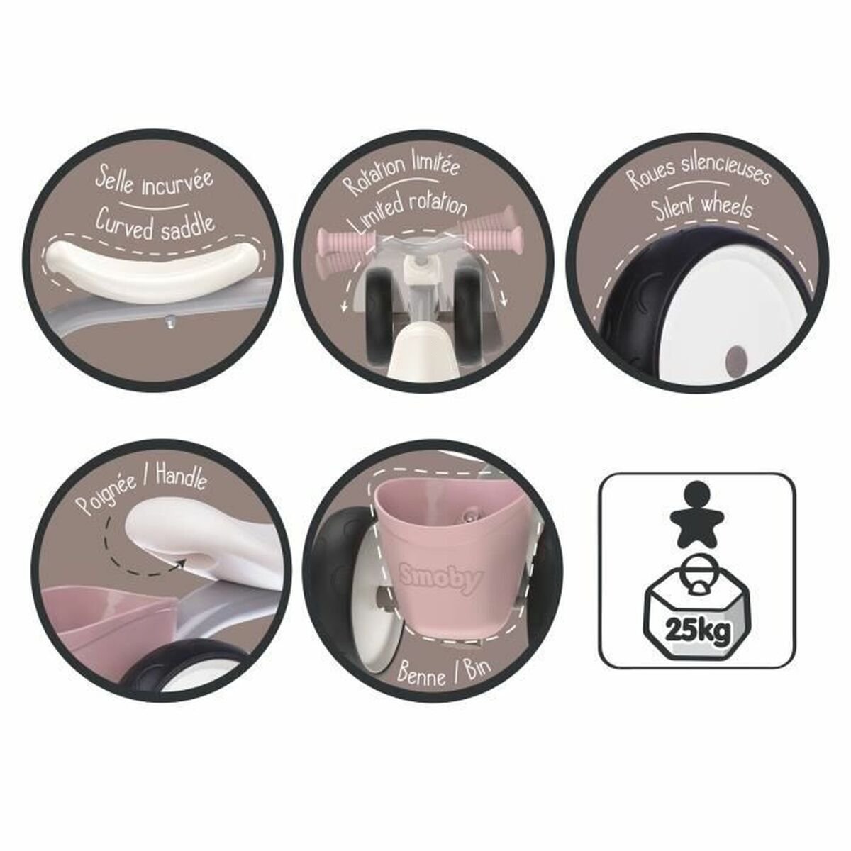 Smoby correpasillos este un accesoriu ideal pentru dezvoltarea și autonomia copiilor începând de la 1 an, proiectat într-o culoare atractivă roz (rose) ce oferă un aspect delicat și atrăgător. Fabricat în principal din plastic, acest port-bebe combină ușurința cu rezistența pentru a facilita învățarea echilibrului și a motricității grosiere la cei mici. Structura sa robustă și sigură este concepută să reziste utilizării intense specifice acestei etape, iar mărimea L asigură confort și stabilitate pentru copiii care încep să facă primii pași. Acest correpasillos Smoby se remarcă prin faptul că este un vehicul fără pedale, care stimulează dezvoltarea psihomotorie, permițând copilului să se propulseze cu picioarele pe sol, promovând coordonarea și încrederea în mișcare. Designul său simplu, sigur și atractiv îl face un instrument practic pentru casă sau spații de joacă, întărind independența timpurie a copiilor printr-un produs ușor și manevrabil. Datorită ergonomiei adaptate și calității materialelor, Smoby correpasillos roz este o opțiune fiabilă și potrivită pentru a însoți copiii în această etapă esențială a creșterii lor. Pe scurt, acest correpasillos este un instrument funcțional care facilitează descoperirea și dezvoltarea fizică a celor mici de la 12 luni.