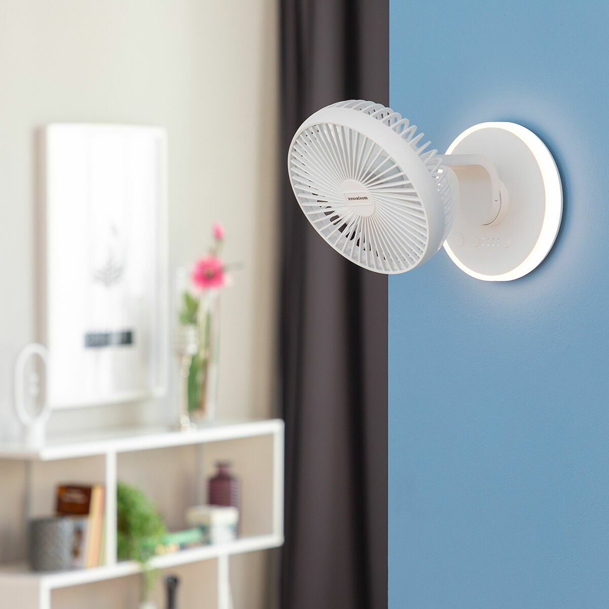 Un ventilator de birou reîncărcabil, ideal pentru a vă bucura de o răcoare directă plăcută. Foarte ușor de luat oriunde. Silențios, 4 viteze, oscilație, lumină LED (3 intensități), înclinare reglabilă, cablu USB-C inclus.