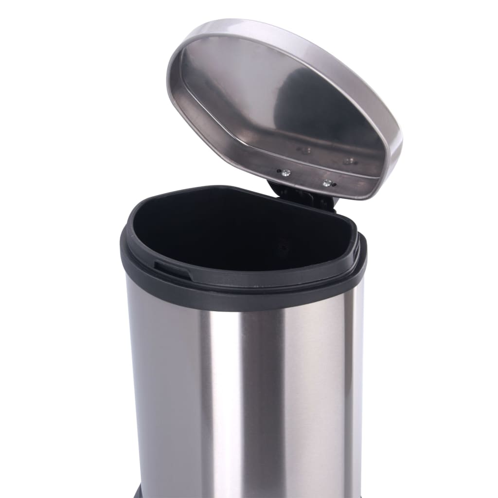 Coșul de gunoi cu pedală Shell, argintiu mat, de la EKO, este un coș de gunoi care folosește spațiul eficient, cu o găleată interioară din plastic de 50 L.