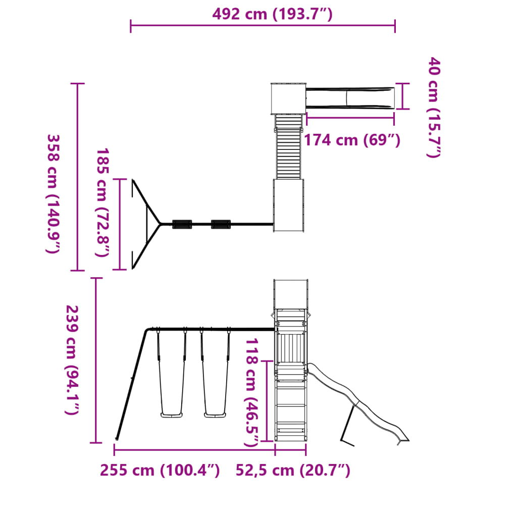 - Dimensiuni (turn mic de joacă): 85 x 52,5 x 239 cm (L x l x î)