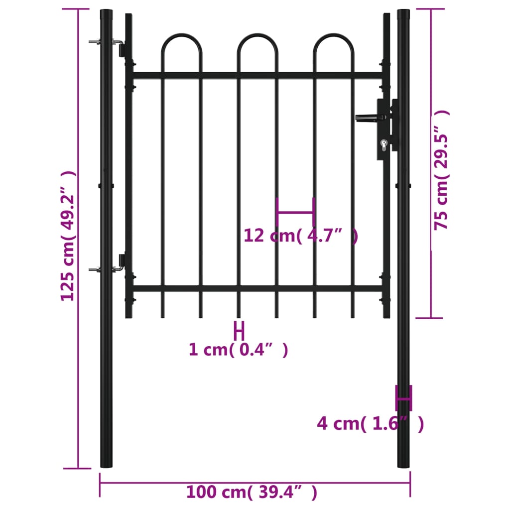 Având un design elegant cu vârfuri rotunjite și o bară solidă orizontală pentru a consolida cadrul, această poartă de grădină va oferi siguranță și va forma un punct de intrare fabulos pe proprietatea dvs. Fiind fabricată din oțel solid, poarta este vopsită electrostatic împotriva ruginii și a coroziunii. Este prevăzută cu o balama pentru încuiere rapidă, și stâlpi, pentru a fi ușor de montat. Trei chei sunt incluse în pachetul de livrare. Această poartă este o combinație minunată de stil, durabilitate, stabilitate și rezistență la coroziune!